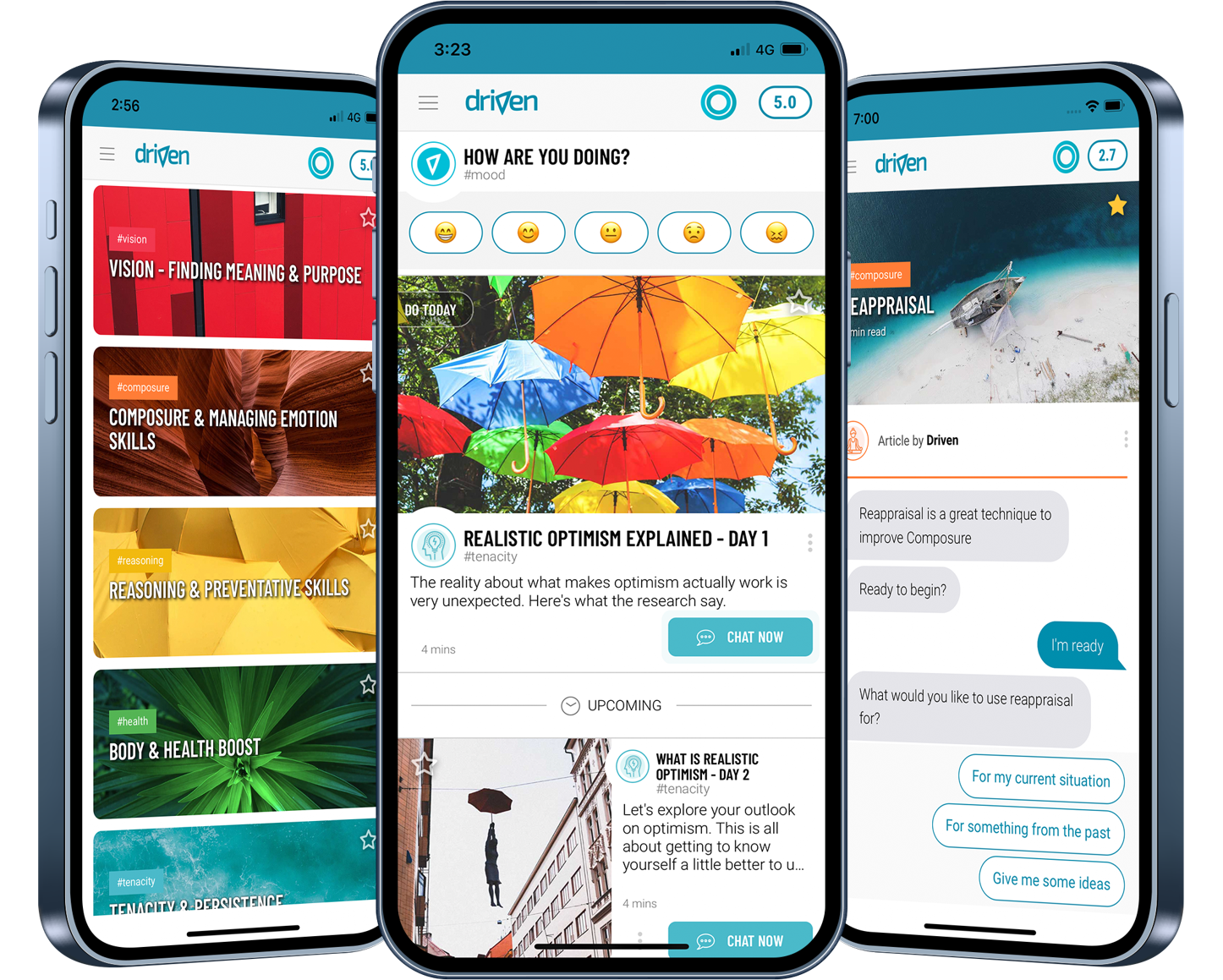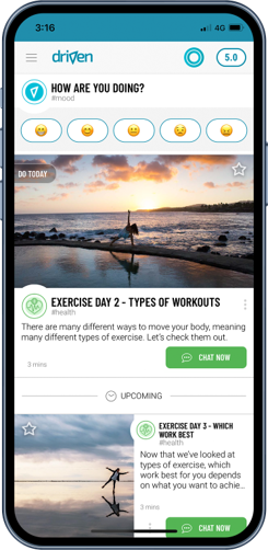 The Driven Resilience App uses a unique virtual coaching approach, becoming your personal resilience expert that’s always on.